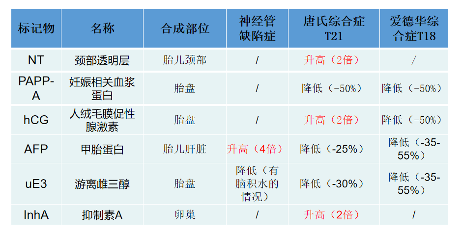 开展产前筛查和产前诊断的预防措施主要依靠孕期血清筛查、绒毛和羊水的细胞遗传学诊断及产前超声诊断。其中血清学筛查方案已普遍开展,该方案是指在特定孕周检测母体妊娠相关血浆蛋白A、血清甲胎蛋白、血清人绒毛膜促性腺激素、血清人绒毛膜促性腺激素游离β亚基、抑制素A和非结合雌三醇指标,结合孕妇的年龄、体重、孕周、病史等 进行综合风险评估,通过风险评估软件计算的风险值,得出胎儿罹患唐氏综合征、18-三体综合征和开放性神经管缺陷的风险度。